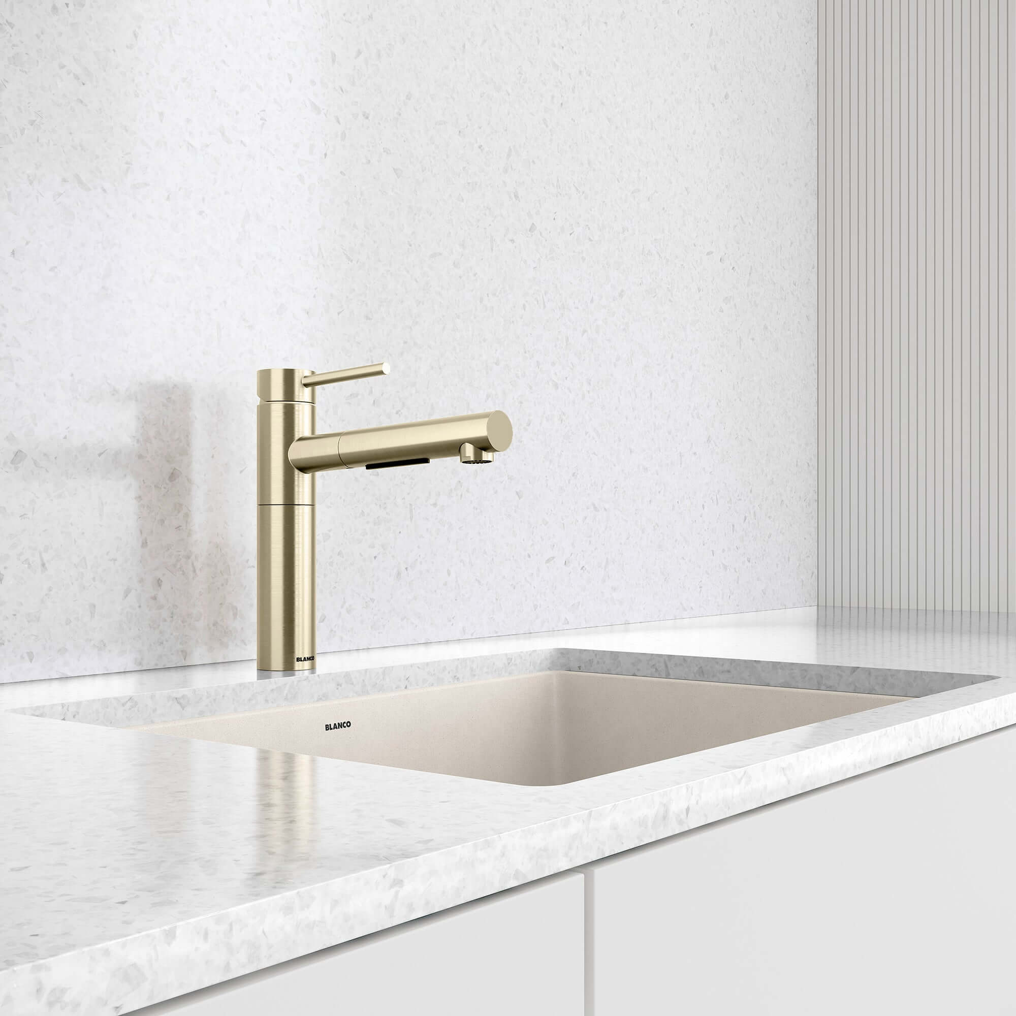 Transform your kitchen workspace with the BLANCO Alta II Low Arc Pull-Out Kitchen Faucet, a modern interpretation of BLANCO's compact classic that delivers professional performance in space-conscious environments. This Italian-engineered faucet is specifically designed for smaller kitchens, installations beneath overhead cabinetry, or any workspace where vertical clearance is limited. The low-arc profile maintains a sleek, unobtrusive presence while the pull-out spray head extends your reach throughout the entire sink area. Solid brass construction with premium PVD metal finish ensures lasting durability and resistance to tarnishing, maintaining its polished appearance through years of daily use in busy kitchen environments.