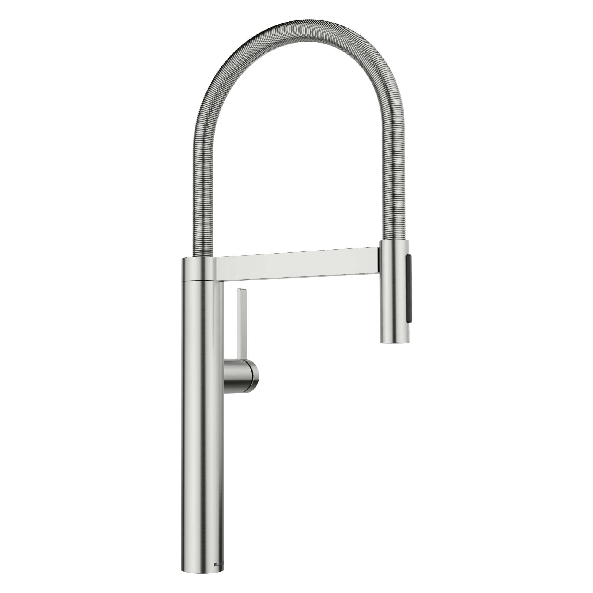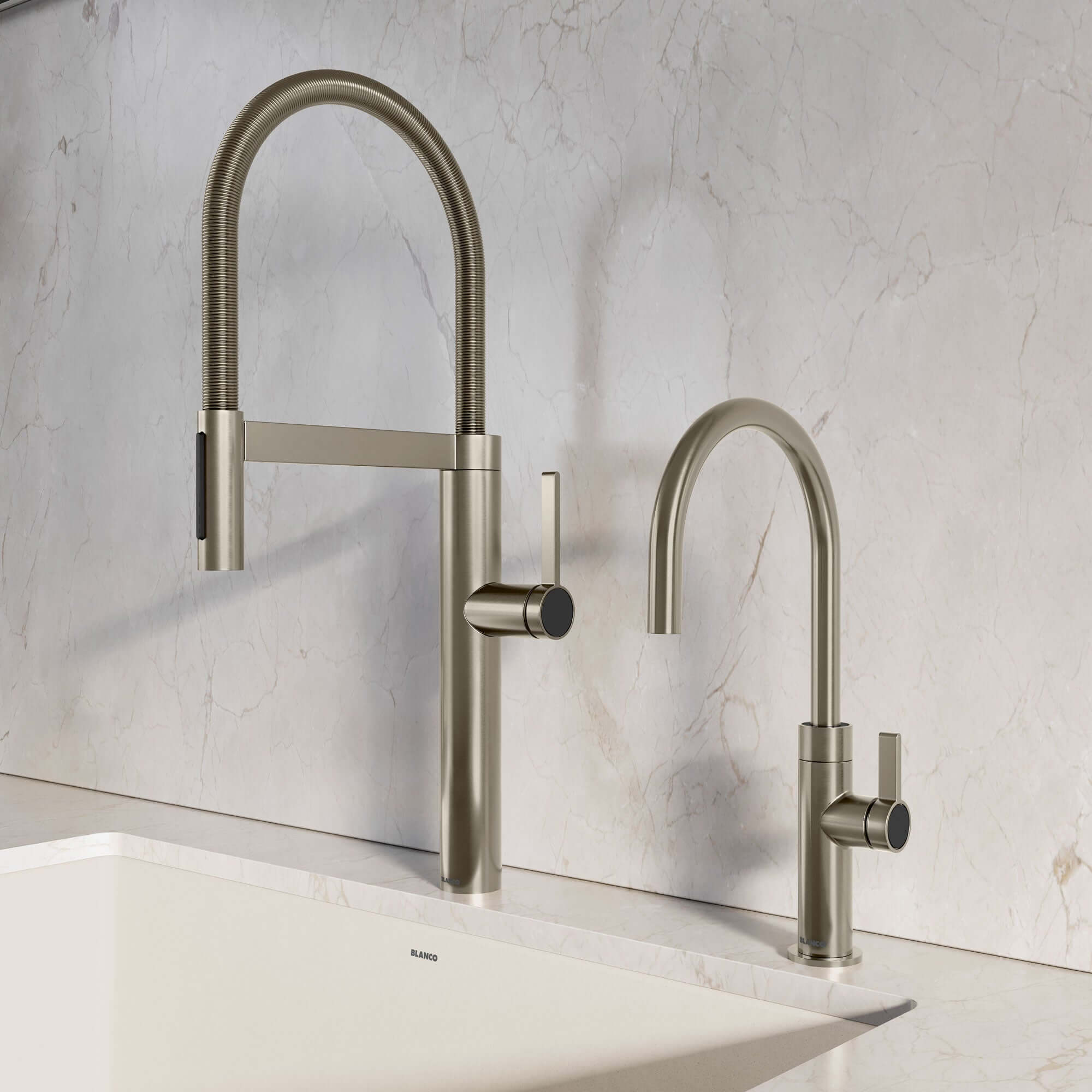 Elevate your kitchen to professional standards with the BLANCO Culina II Semi-Pro Pull-Down Kitchen Faucet, BLANCO's iconic design that brings commercial-grade performance and styling to residential kitchens. This thoughtfully engineered faucet combines the robust functionality of restaurant equipment with refined aesthetics suited for home environments, making it the centerpiece of any serious home chef's workspace. The distinctive high-arc gooseneck design provides exceptional clearance for filling large stockpots and cleaning oversized baking sheets, while the pull-down spray head extends your reach throughout the entire sink area. Solid brass construction with premium PVD metal finish ensures lasting durability and resistance to tarnishing, maintaining its polished appearance through years of intensive daily use in busy kitchen environments.