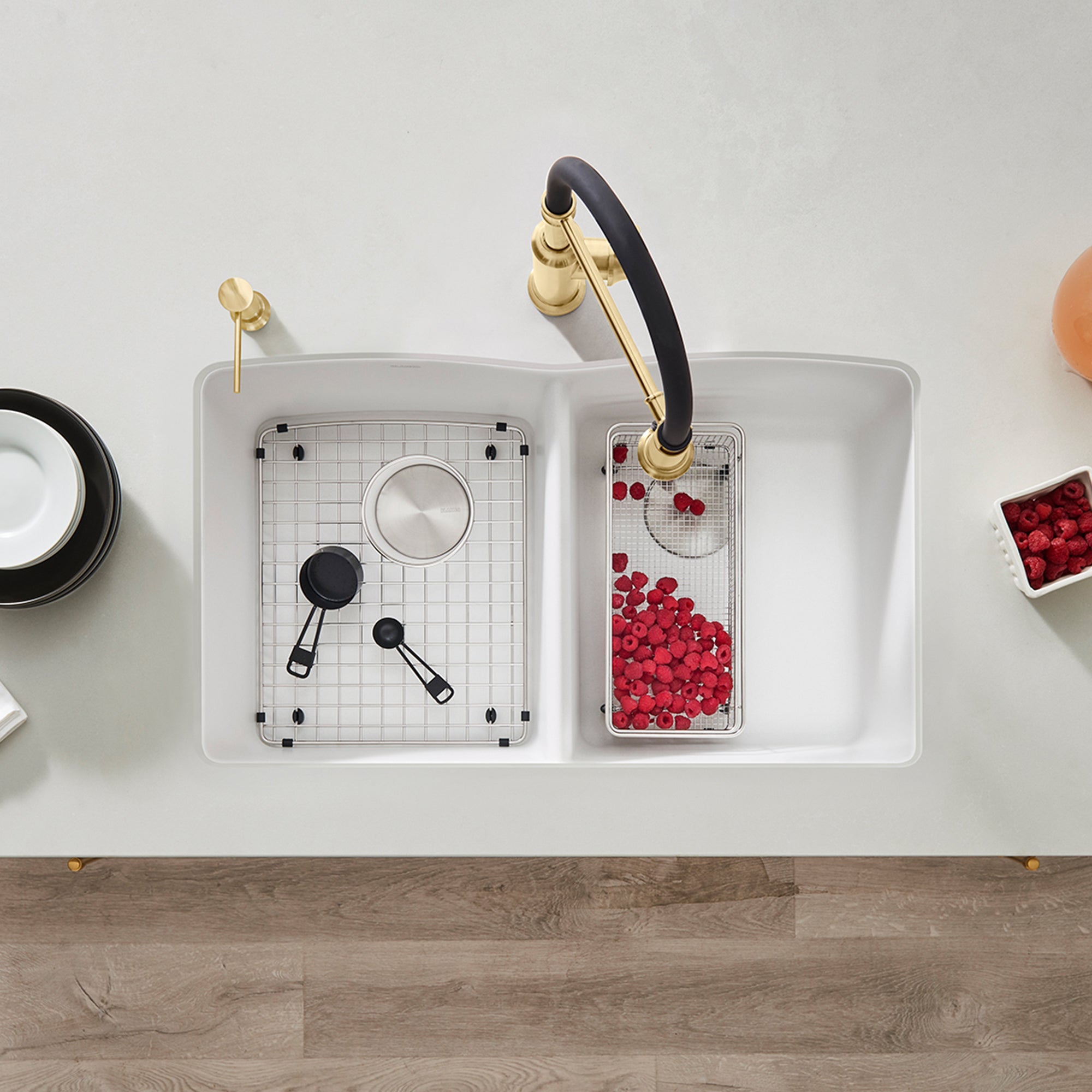 • 50/50 equal bowl configuration provides balanced workspace for multi-tasking
