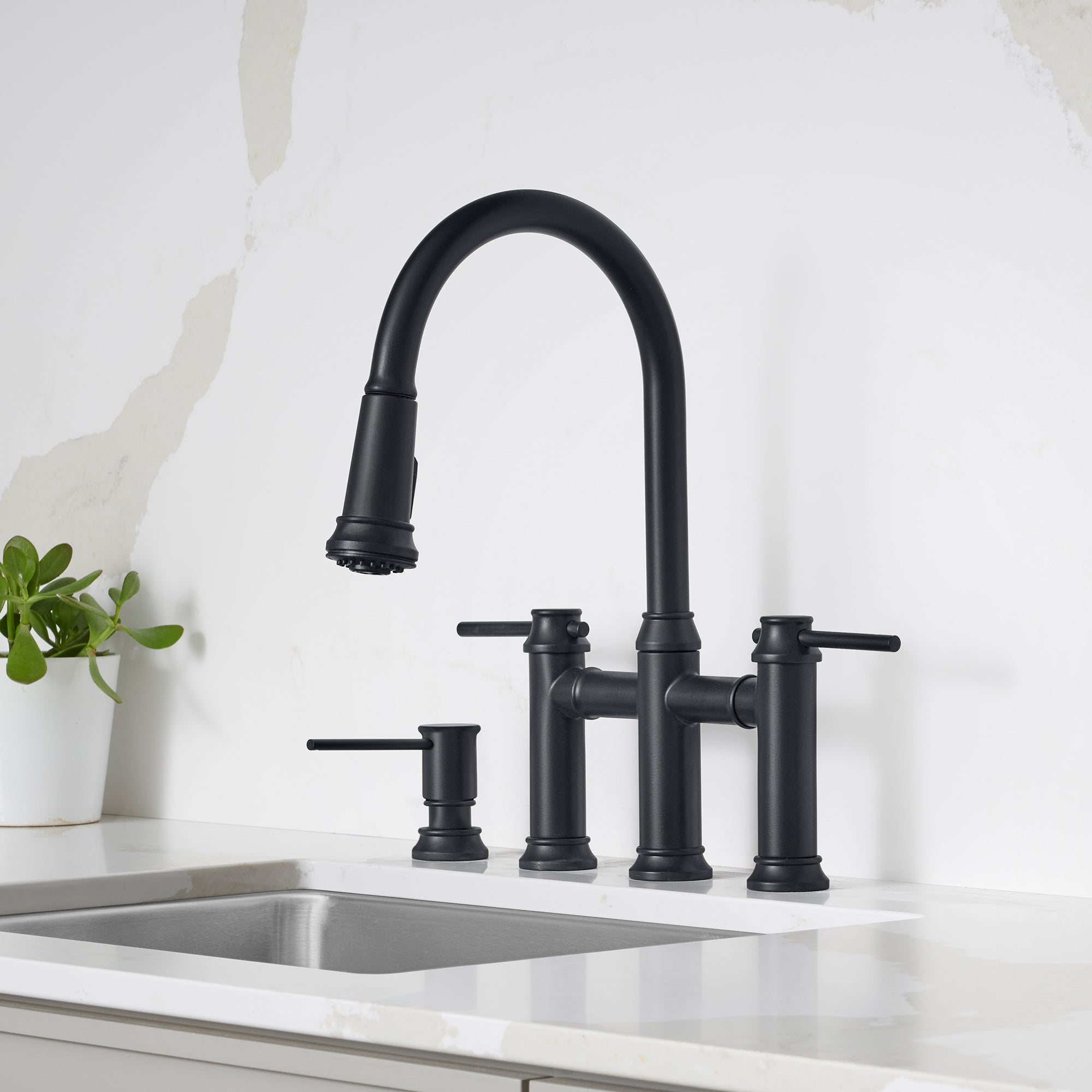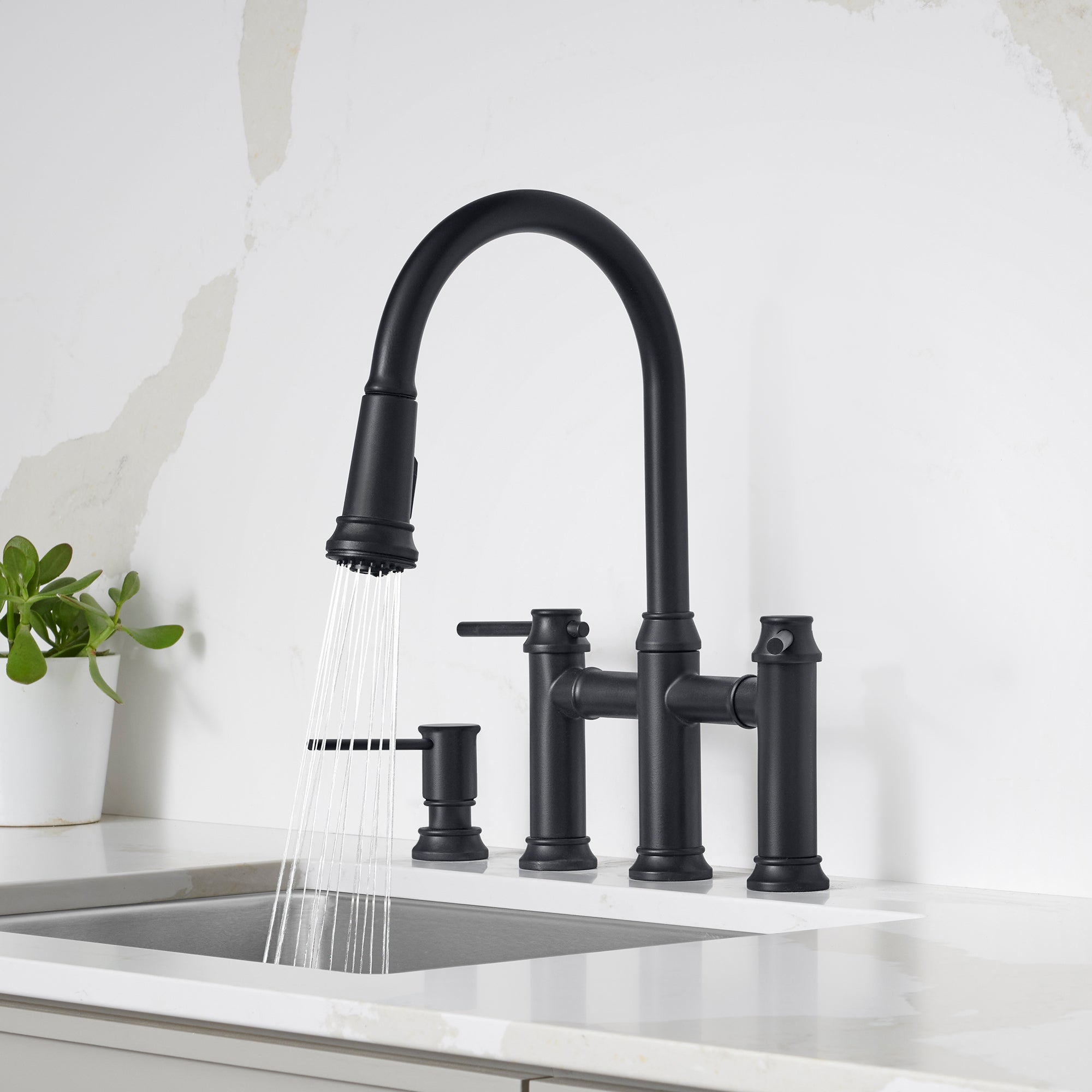 Experience precise water control through the traditional two-handle configuration that allows independent adjustment of hot and cold water temperature, providing the tactile satisfaction and visual symmetry that define classic bridge faucet design. The pull-down spray system extends from the central spout body, delivering dual-spray functionality that switches between powerful spray for heavy-duty cleaning and gentle stream for everyday tasks. The 180-degree spout rotation provides extended coverage throughout your sink workspace, while the 7.88-inch spout height with 9-inch reach delivers practical clearance for filling containers and cleaning large items. The exposed bridge connection creates visual continuity across the three mounting points, and the 1.5 GPM flow rate balances effective water delivery with efficient consumption for sustainable kitchen operation.