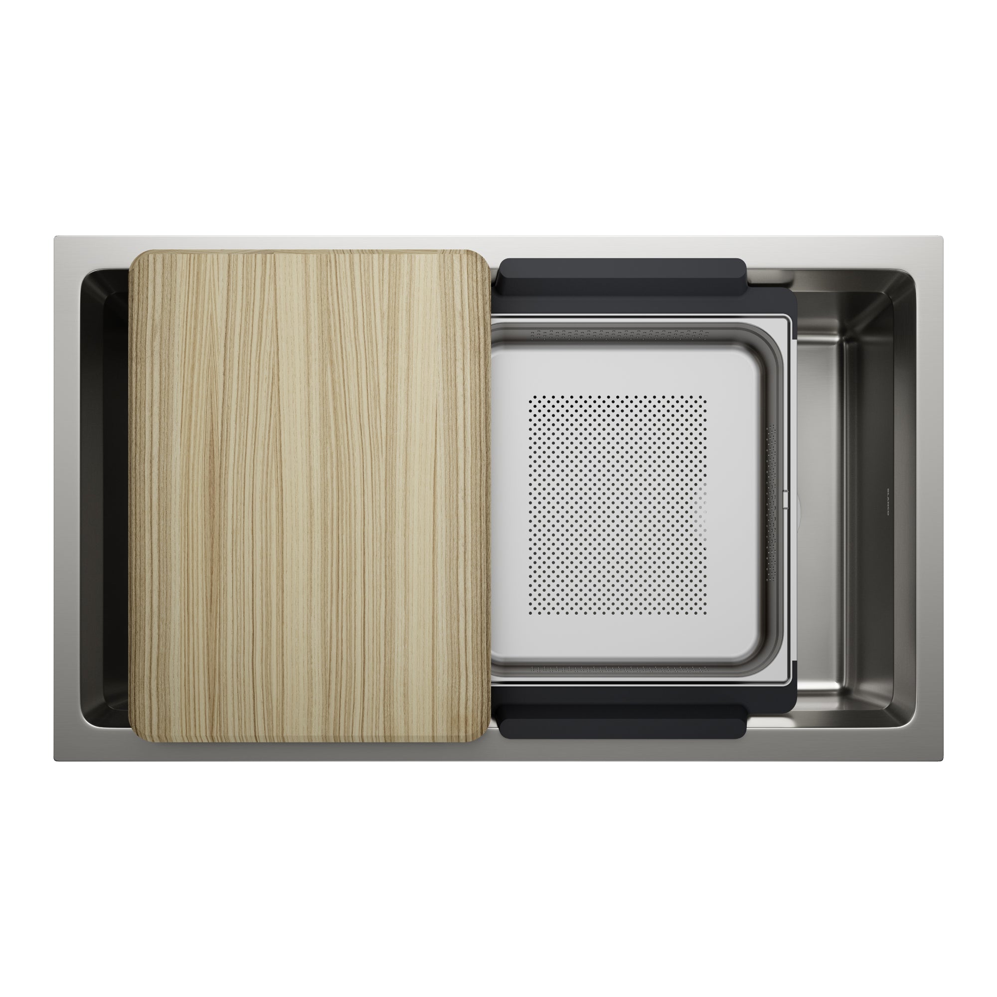 Transform your kitchen efficiency with the BLANCO INTEOS 33, a comprehensive workstation sink system that integrates food preparation, washing, and organization into a single streamlined workspace. This German-engineered 33" undermount stainless steel workstation features innovative angled ledges that support sliding accessories, allowing you to position cutting boards, colanders, and trays exactly where you need them during meal preparation. The system includes a premium wood cutting board, large colander, and accessory holder that slide smoothly along the sink's edge, creating a dynamic workspace that adapts to your cooking workflow. The generous 29.75" x 15.75" interior basin with 9" depth provides ample room for washing large cookware while the ledge-mounted accessories remain accessible above, maximizing your functional workspace without requiring additional counter space.