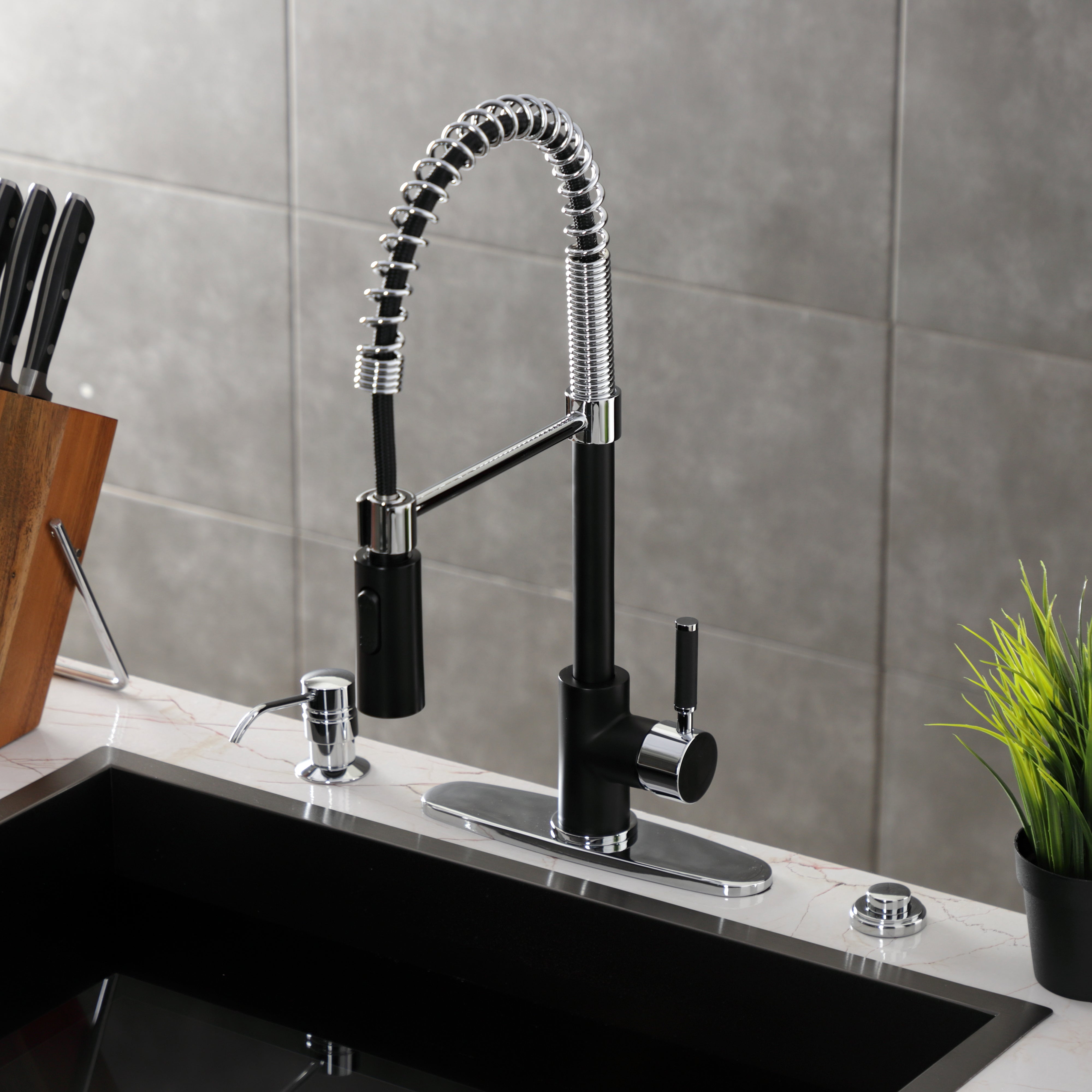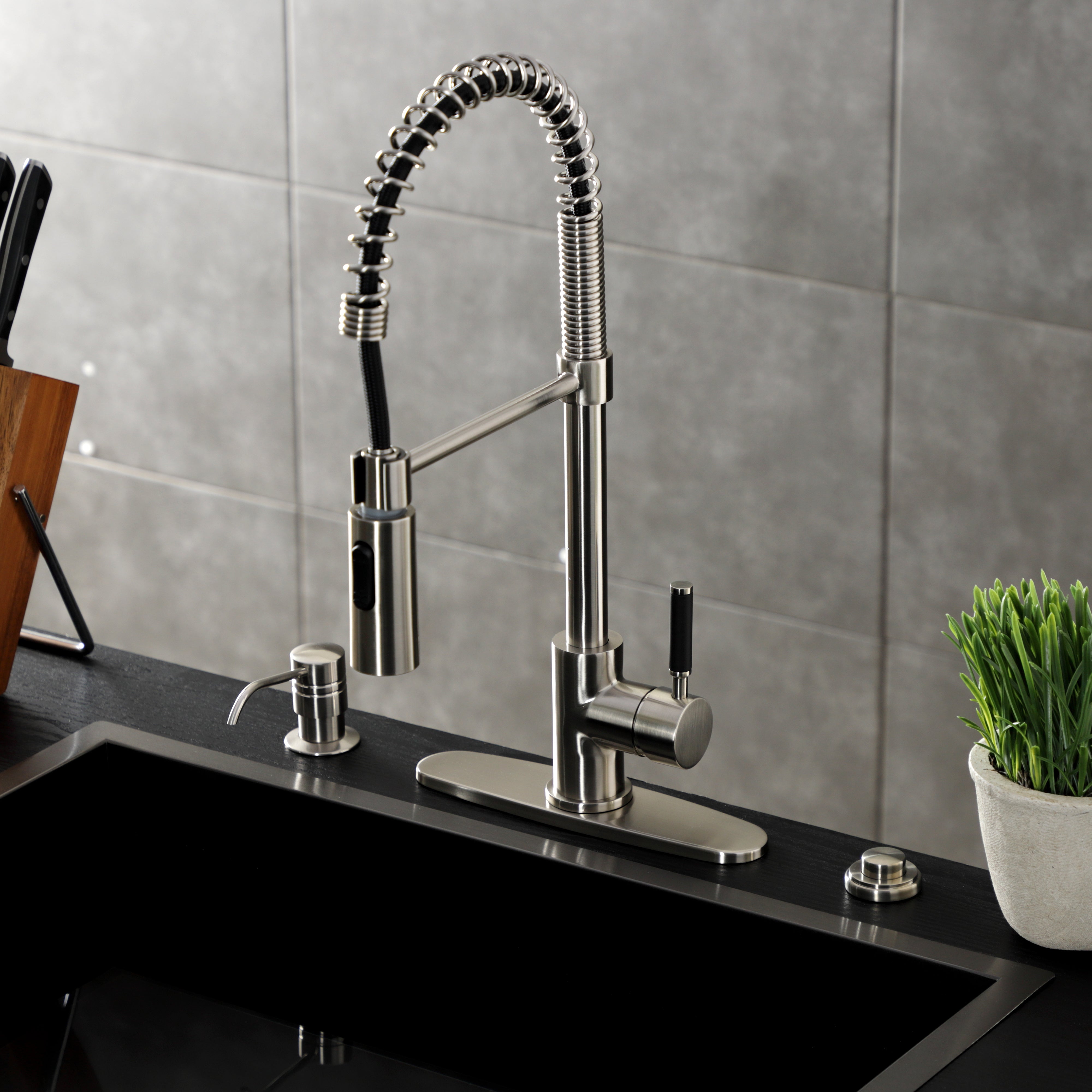 The Kingston Brass LS8773DKL Kaiser Single-Handle Pre-Rinse Kitchen Faucet tastefully interweaves top-notch ergonomic design with contemporary simplicity. The distinctive black silicone rubber-coated handle provides comfortable grip and modern contrast against the cylindrical body, while the high-arching spout rises 19-5/8" to provide exceptional clearance for professional kitchen tasks. Constructed from solid brass and stainless steel for lasting durability, this faucet combines state-of-the-art functionality with sleek industrial styling. The exposed spring design adds authentic commercial character to your kitchen.