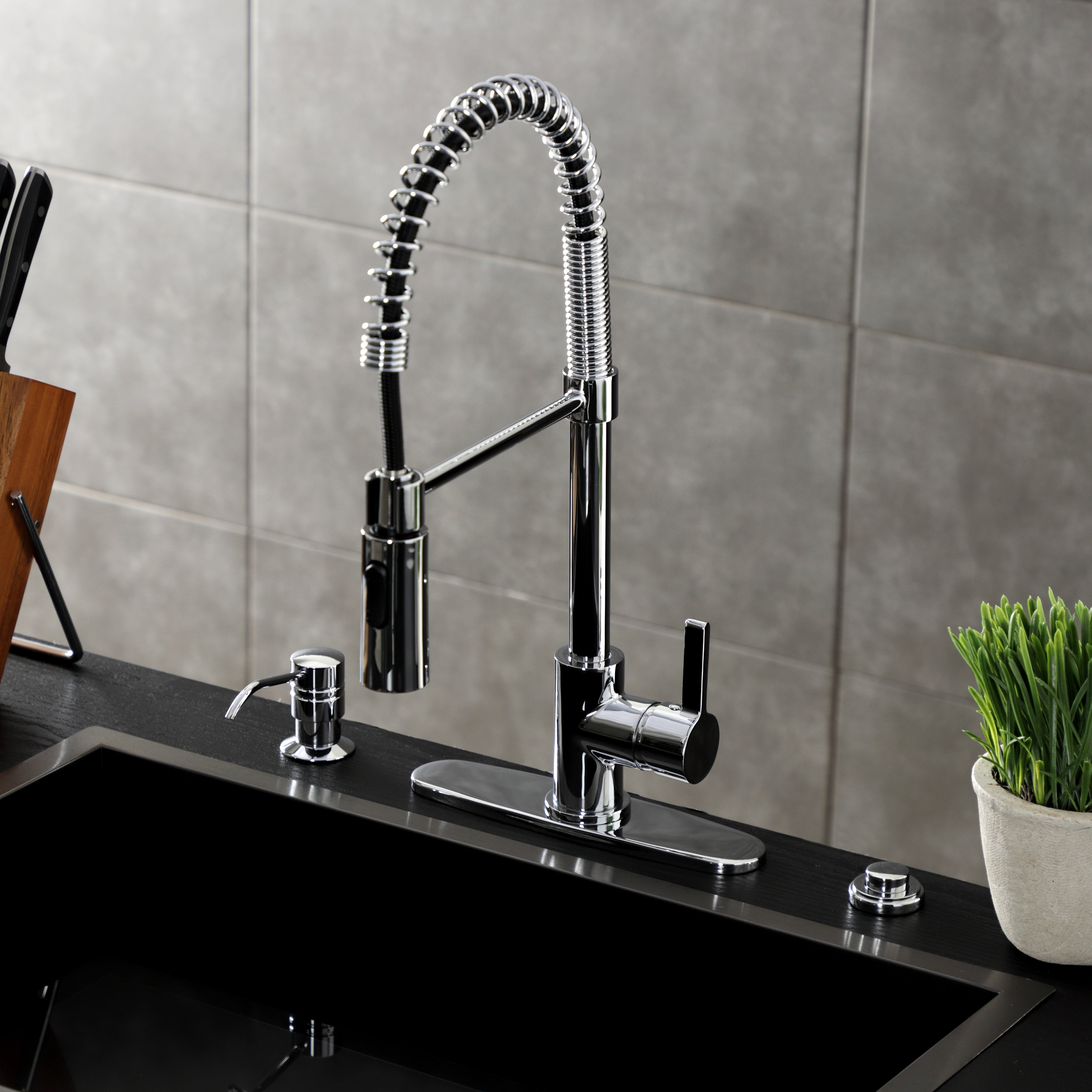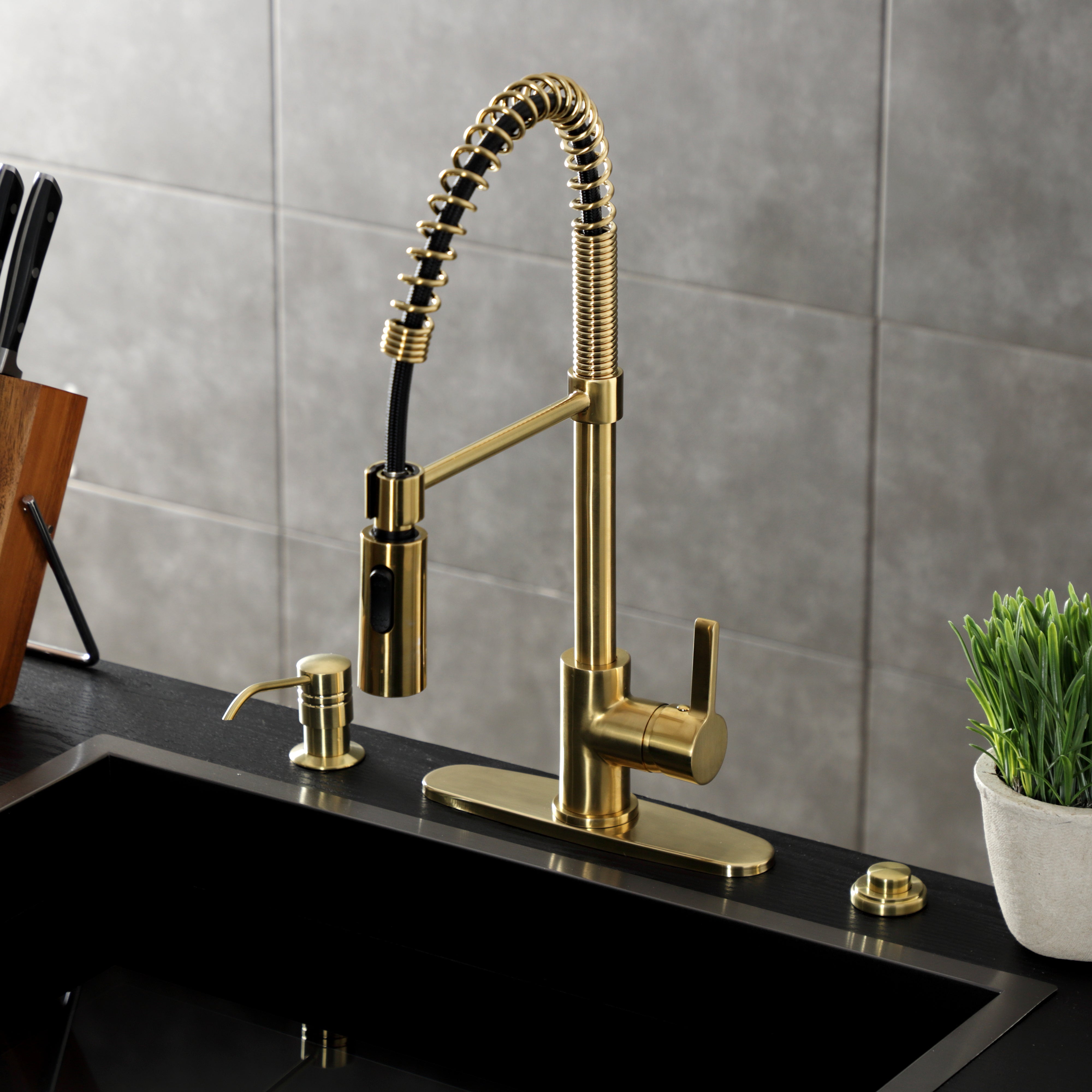 The Kingston Brass LS877CTLAB Continental Single-Handle Pre-Rinse Kitchen Faucet showcases brilliant craftsmanship with its modern curved spout and ergonomic lever handle. Standing 19-5/8" tall, this faucet brings futuristic sophistication to your kitchen while delivering professional-grade functionality. Constructed from solid brass and stainless steel for exceptional durability, the warm finish provides lasting beauty and elegance. The exposed spring design adds industrial character while the sleek curved architecture creates contemporary visual appeal.