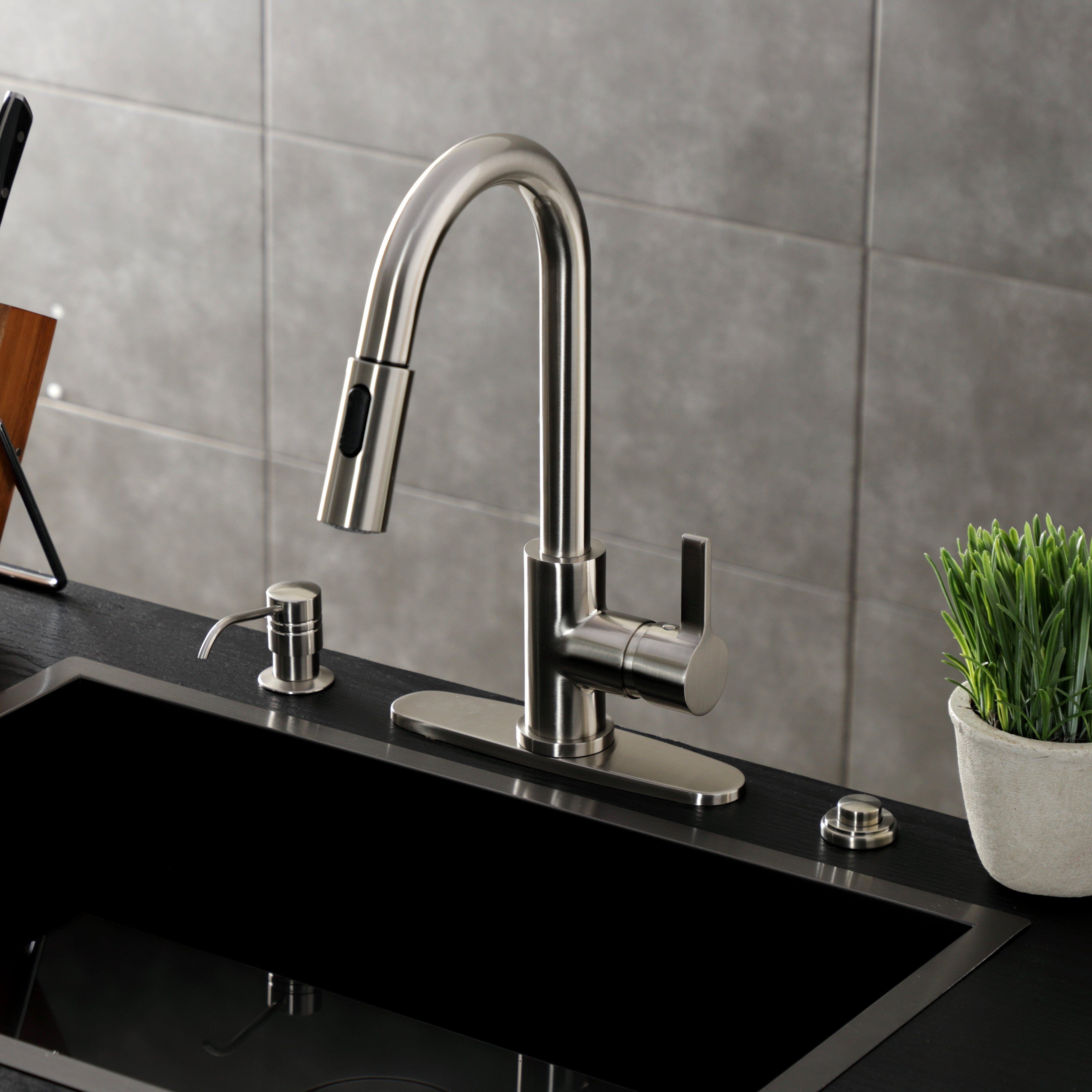The Kingston Brass LS8783CTL Continental Single-Handle Pull-Down Kitchen Faucet combines brilliant craftsmanship with modern functionality. The high-arching spout rises 16-1/4" to provide generous clearance for filling stockpots and washing oversized cookware, while the curved design adds contemporary elegance to your kitchen. Constructed from solid brass and stainless steel for exceptional durability, the premium finish delivers lasting beauty. The ergonomic single lever handle provides intuitive control of water temperature and flow.