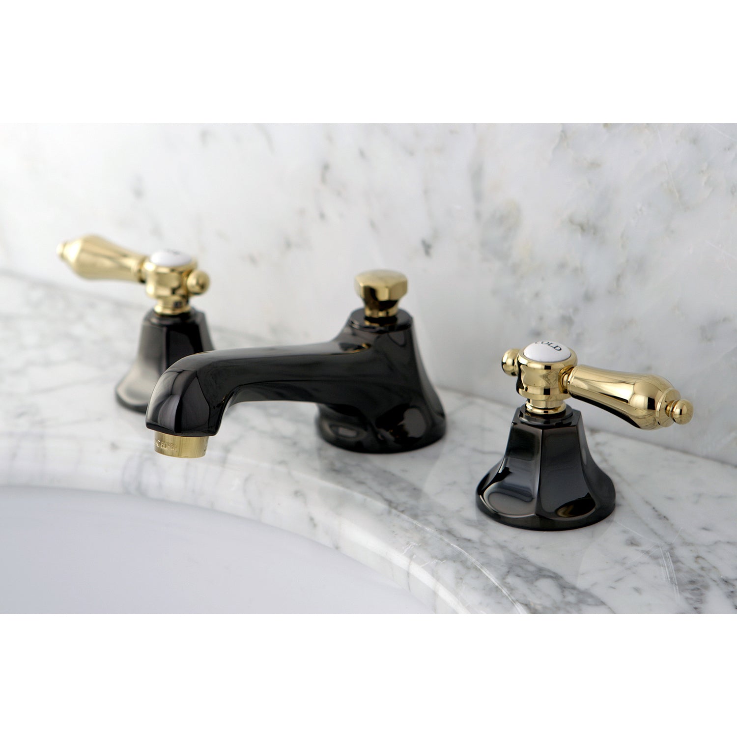 The Kingston Brass NS4469BAL Water Onyx Widespread Bathroom Faucet showcases a sophisticated two-tone design that pairs black stainless steel with polished brass accents. This distinctive finish combination creates visual depth and allows the faucet to bridge warm and cool color palettes in your bathroom. The dual lever handles provide modern, intuitive operation while the solid brass construction ensures commercial-grade durability. A matching two-tone brass pop-up drain maintains the coordinated aesthetic throughout your vanity installation.