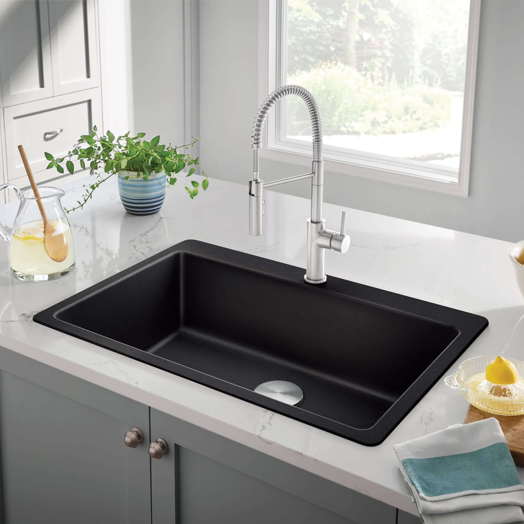 Maximize your kitchen efficiency with the BLANCO Liven 33" Super Single sink, engineered to provide an expansive uninterrupted workspace that measures over 30 inches in length. This generous single bowl configuration eliminates the dividers and compartments that restrict movement in double bowl designs, creating a spacious basin that effortlessly accommodates the largest roasting pans, baking sheets, and stockpots without requiring awkward angling or positioning. The exceptional 9-inch bowl depth provides ample capacity for filling large pots, soaking multiple baking dishes simultaneously, or washing oversized cookware that won't fit in divided configurations. Pre-drilled with a single faucet hole and four knockout options, this sink offers exceptional customization potential for creating a complete kitchen workspace with soap dispensers, instant hot water systems, or pot fillers that enhance your cooking efficiency.