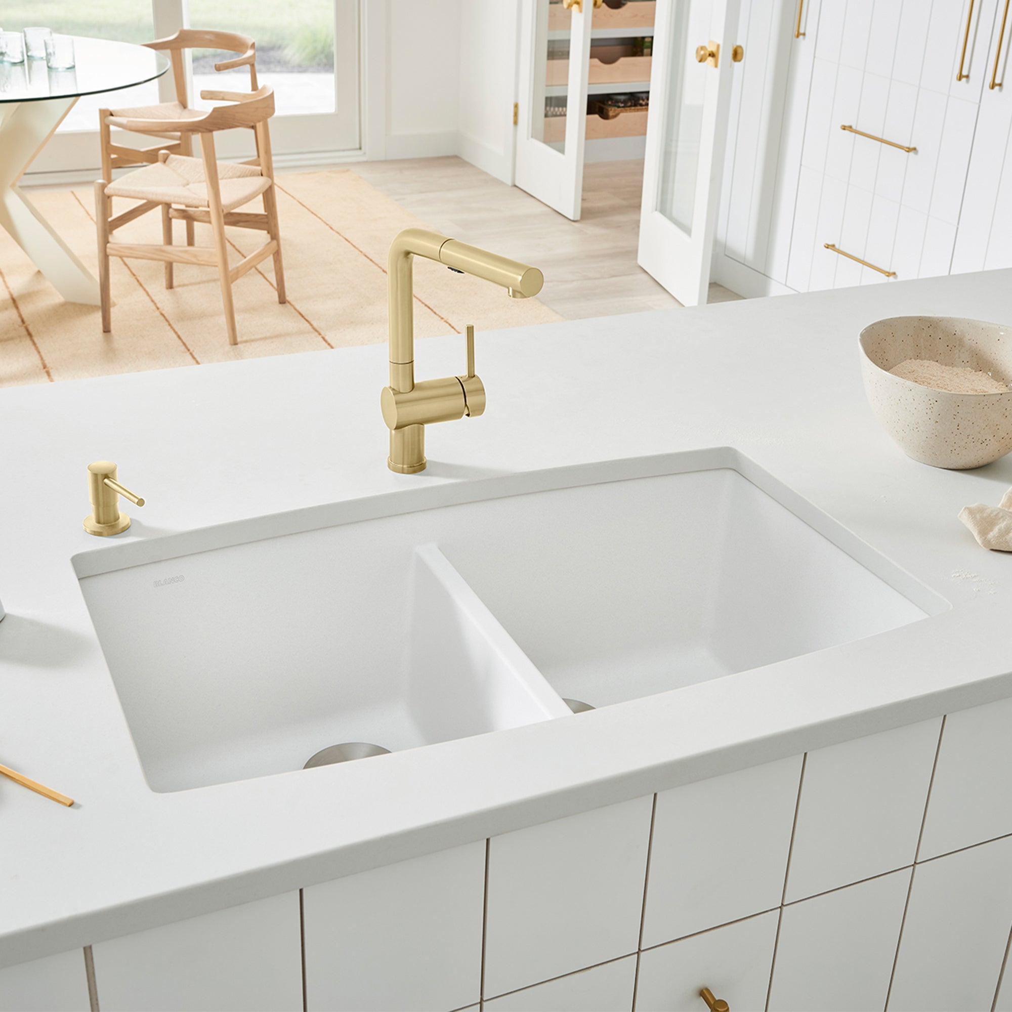 The Performa collection represents BLANCO's approach to delivering core SILGRANIT performance in straightforward designs that prioritize functional efficiency over decorative embellishments. While utilizing identical 80% quartz composite formulation as premium BLANCO collections, Performa focuses on proven basin geometries and standard installation methods that reduce manufacturing complexity without compromising material quality or durability. This design philosophy results in sinks that deliver the stain resistance, thermal stability, and longevity expected from SILGRANIT composite while maintaining accessible pricing that suits budget-conscious kitchen renovations. The collection proves particularly appropriate for rental properties, investment homes, or primary residences where owners prioritize long-term durability and low maintenance over cutting-edge design aesthetics, as the straightforward styling remains visually appropriate across changing design trends.