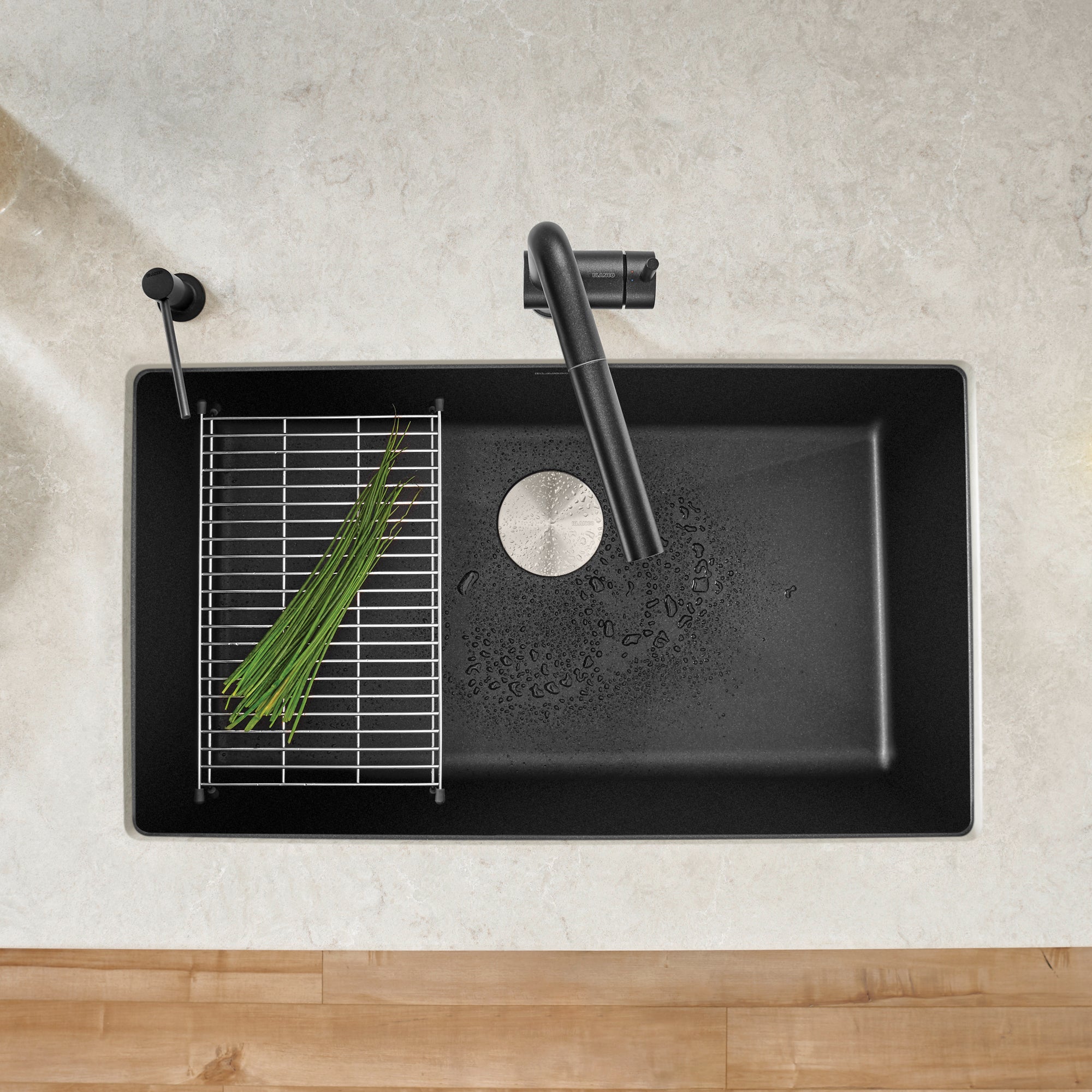 Redefine your kitchen workspace with the BLANCO Precis 32" Super Single Undermount, a sink that marries minimalist design philosophy with expansive single-basin functionality. Constructed from 80% natural quartz sand—nature's hardest granite component—this German-engineered SILGRANIT composite sink delivers exceptional durability while maintaining the clean geometric lines that define the Precis collection. The undermount configuration creates uninterrupted countertop surfaces that emphasize contemporary design aesthetics, while the generous 30" x 17" basin interior eliminates divider constraints that limit workspace in multi-bowl configurations. The 9.5" basin depth provides substantial vertical capacity for large cookware, stacked dishes, or filling tall containers. The Anthracite finish extends completely through the composite material, ensuring color consistency that persists despite scratches or surface impacts over years of intensive kitchen use.