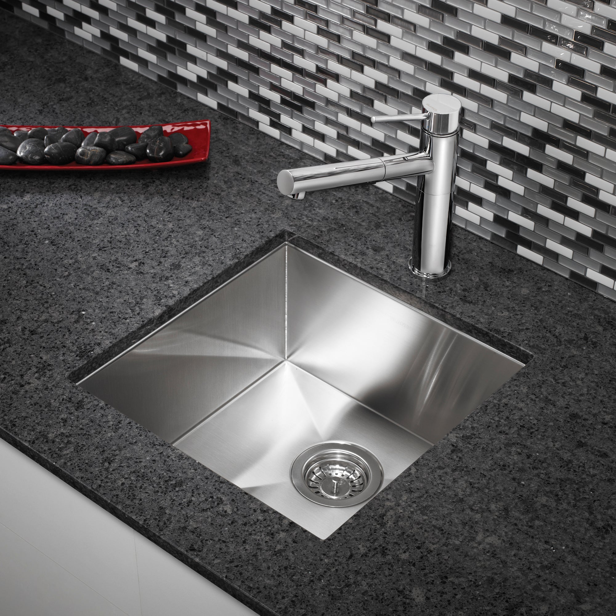 Maximize functionality in compact spaces with the BLANCO QUATRUS R0, a 17" undermount stainless steel bar sink that delivers German engineering precision in a space-efficient square footprint. Manufactured in Germany with meticulous attention to detail, this compact bar sink features zero-radius corners that create sharp 90-degree angles, maximizing every inch of the 15" x 15" interior basin while delivering the clean architectural lines that define contemporary kitchen and bar design. The 18-gauge premium stainless steel construction provides exceptional durability and corrosion resistance, while the 8" basin depth offers generous capacity for washing glassware, barware, and food preparation tasks without overwhelming smaller installations. The undermount installation creates seamless countertop integration that simplifies cleanup and enhances visual appeal, making this sink ideal for kitchen islands, wet bars, and butler pantries where space efficiency is essential.