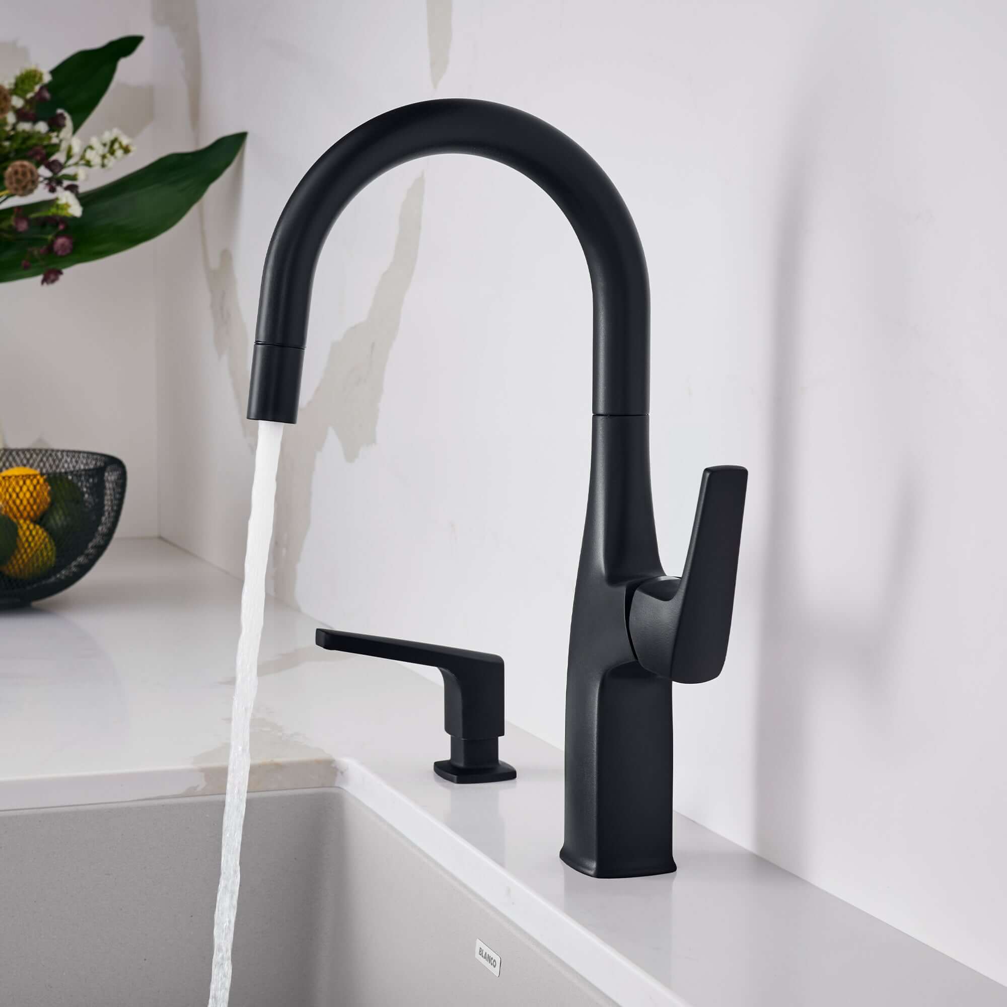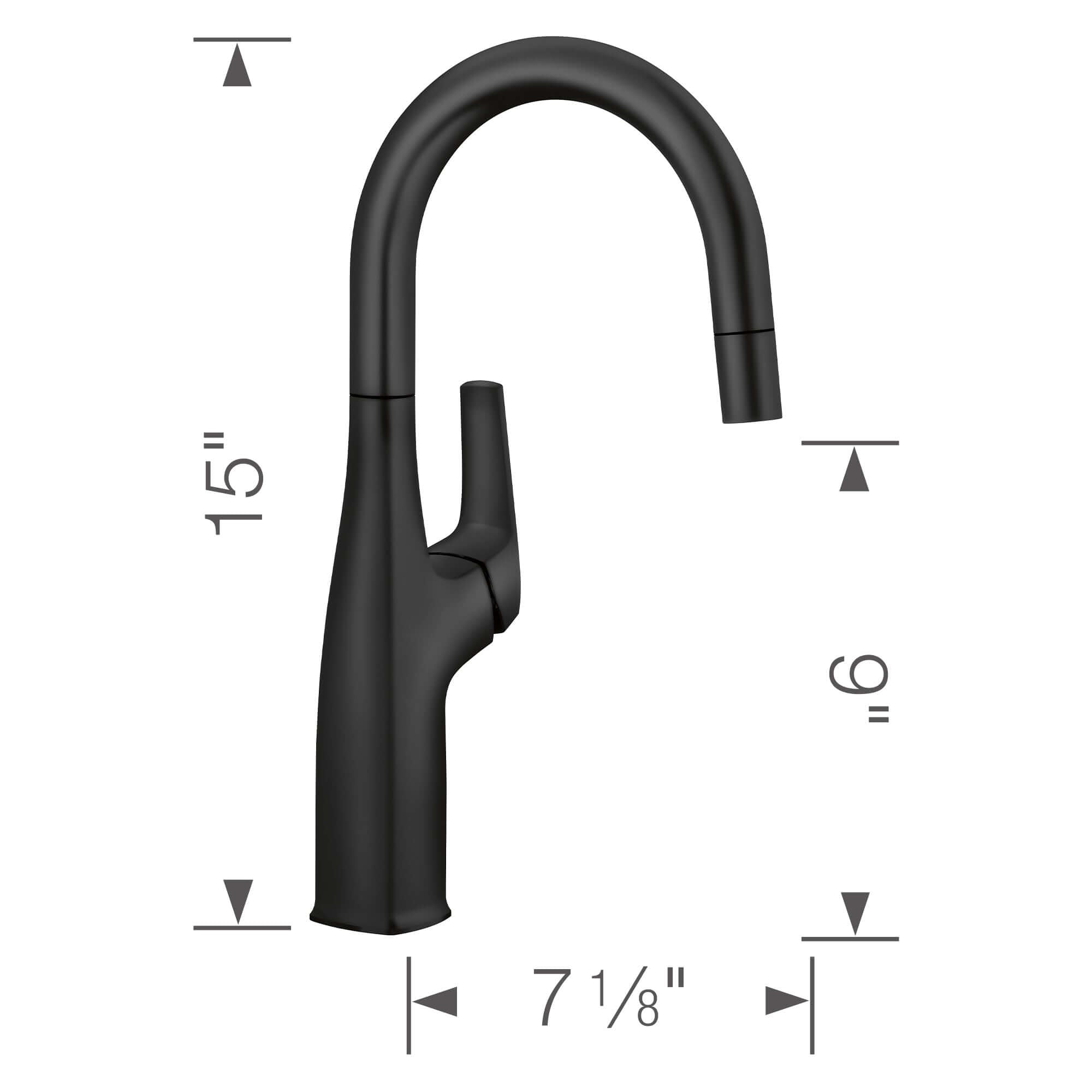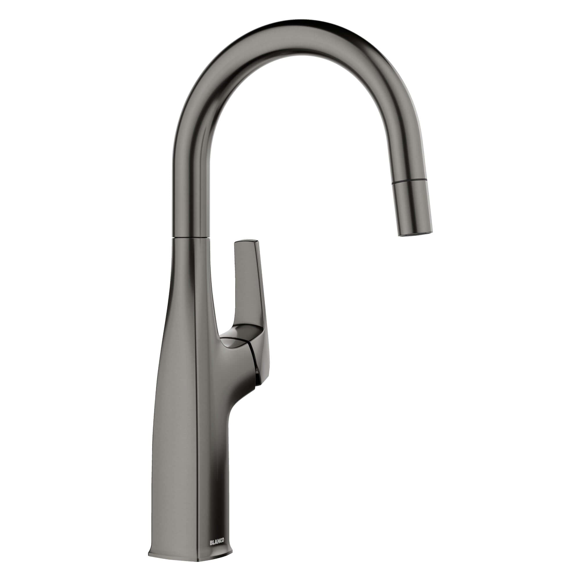 Transform your kitchen island, wet bar, or compact kitchen space with the BLANCO Rivana pull-down bar faucet, where sleek contemporary design meets practical functionality. This thoughtfully designed faucet features a distinctive square base that transitions seamlessly into a rounded spout, creating an elegant blend of geometric precision and organic form. The concealed spray head maintains clean, streamlined aesthetics while delivering full pull-down functionality, making it an ideal solution for installations where space efficiency and modern design are equally important. Constructed from solid brass with premium finish options, the Rivana provides professional-grade durability in a compact footprint perfectly suited for bar areas and smaller kitchen workspaces.