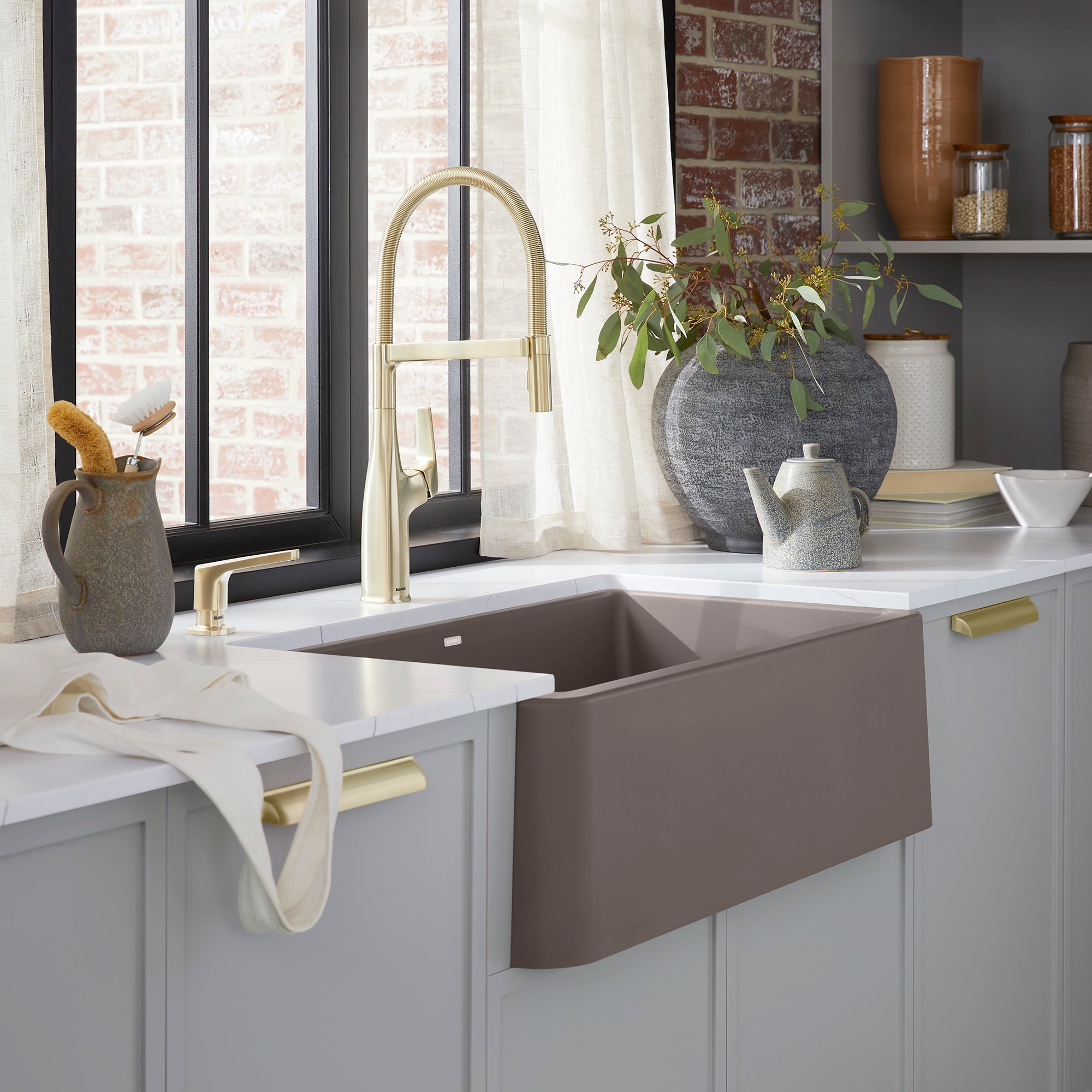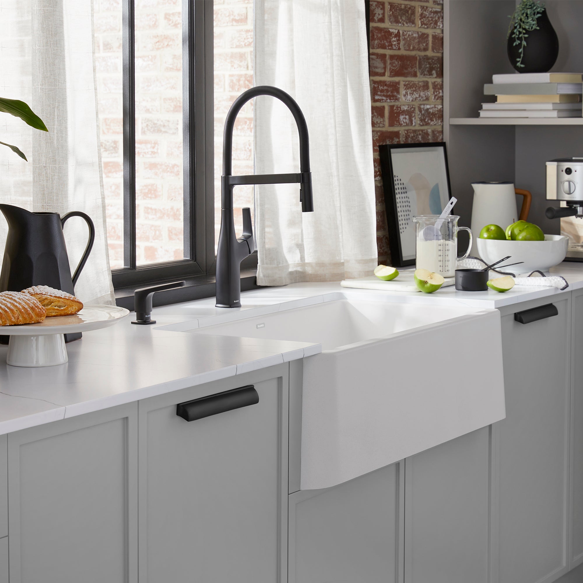 Experience versatile water delivery through the powerful pull-down dual-spray system that switches effortlessly between spray modes for comprehensive kitchen coverage. The high-arc gooseneck spout rotates a full 360 degrees, providing complete access to every area of your sink and surrounding workspace, while the 9-inch spout height delivers generous clearance for filling tall containers and cleaning oversized cookware. The magnetic spray holder ensures secure docking after each use, keeping the spray head firmly in place while maintaining the clean lines that define the Rivana aesthetic. The 1.5 GPM flow rate balances powerful performance with water efficiency, and the single-hole installation with single-handle control provides streamlined operation that professional and home chefs appreciate for its intuitive functionality.
