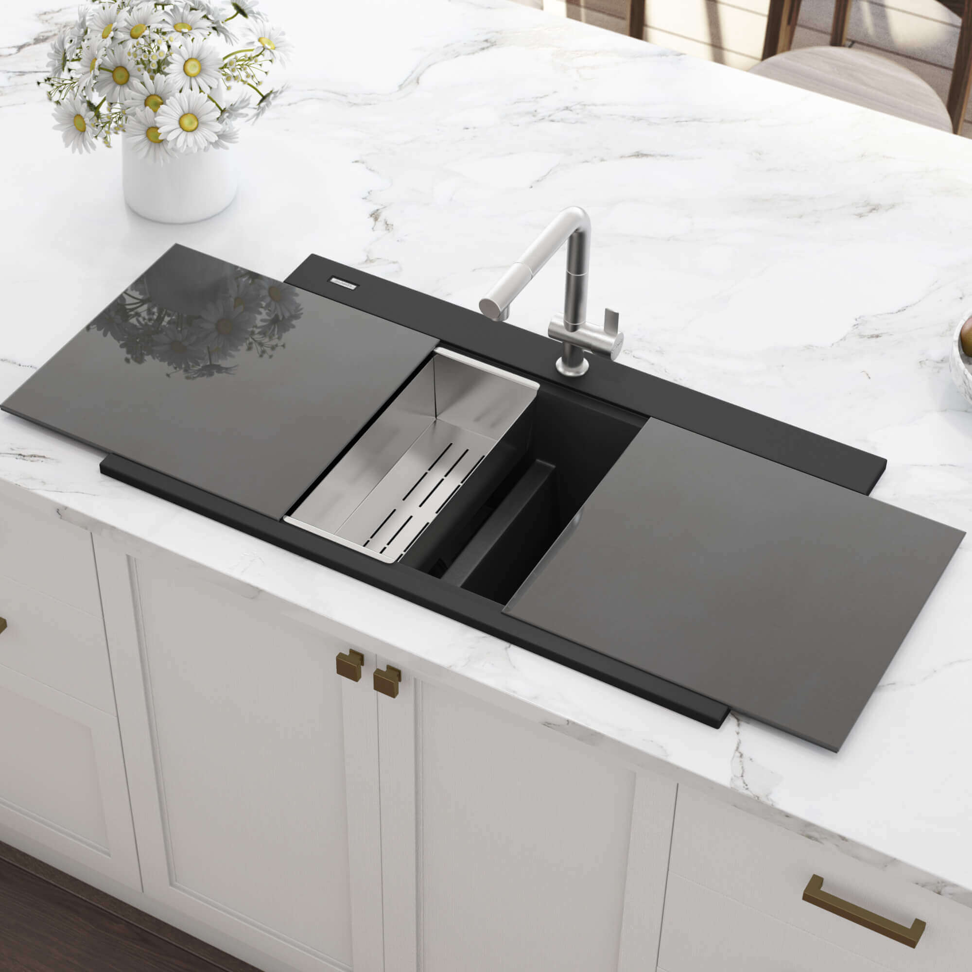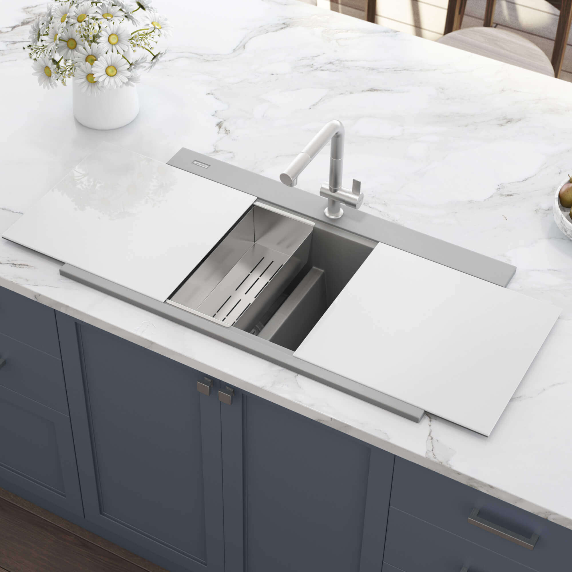 This complete workstation system includes two tempered glass cutting boards, one stainless steel colander, two matching white strainers (drain assembly), cutout template, mounting clips, and installation guide. The workstation ledges on the front and back act as tracks for sliding the built-in accessories, allowing you to create a complete food preparation station right at your sink. The accessories are designed specifically for this sink model to ensure perfect fit and optimal functionality.