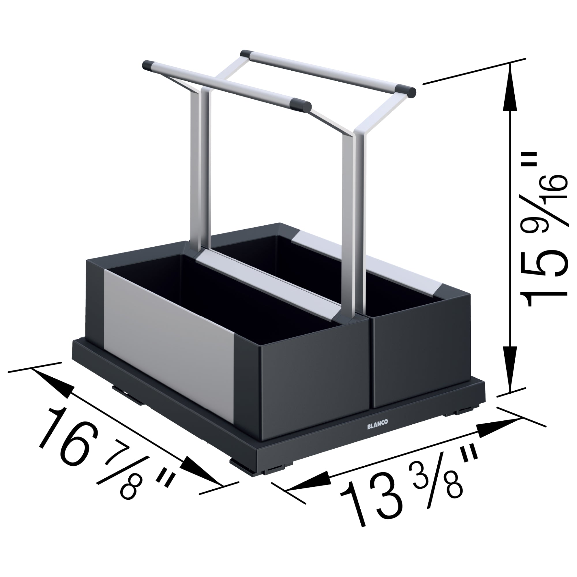 The BLANCO Double Under Sink Storage Organizer measures 16.33" in length, 13.4" in width, and 15.5" in height, making it compatible with standard kitchen sink base cabinets. Before installation, measure your cabinet interior to ensure adequate clearance for the full-extension slides and the height of the caddy system. The flexible installation options allow for adaptation to various cabinet configurations, though you should account for plumbing fixtures and garbage disposal units that may affect placement. The complete hardware package includes all necessary mounting components, and the installation sheet provides detailed guidance for proper positioning to maximize storage capacity while maintaining clearance for cabinet doors and existing plumbing.