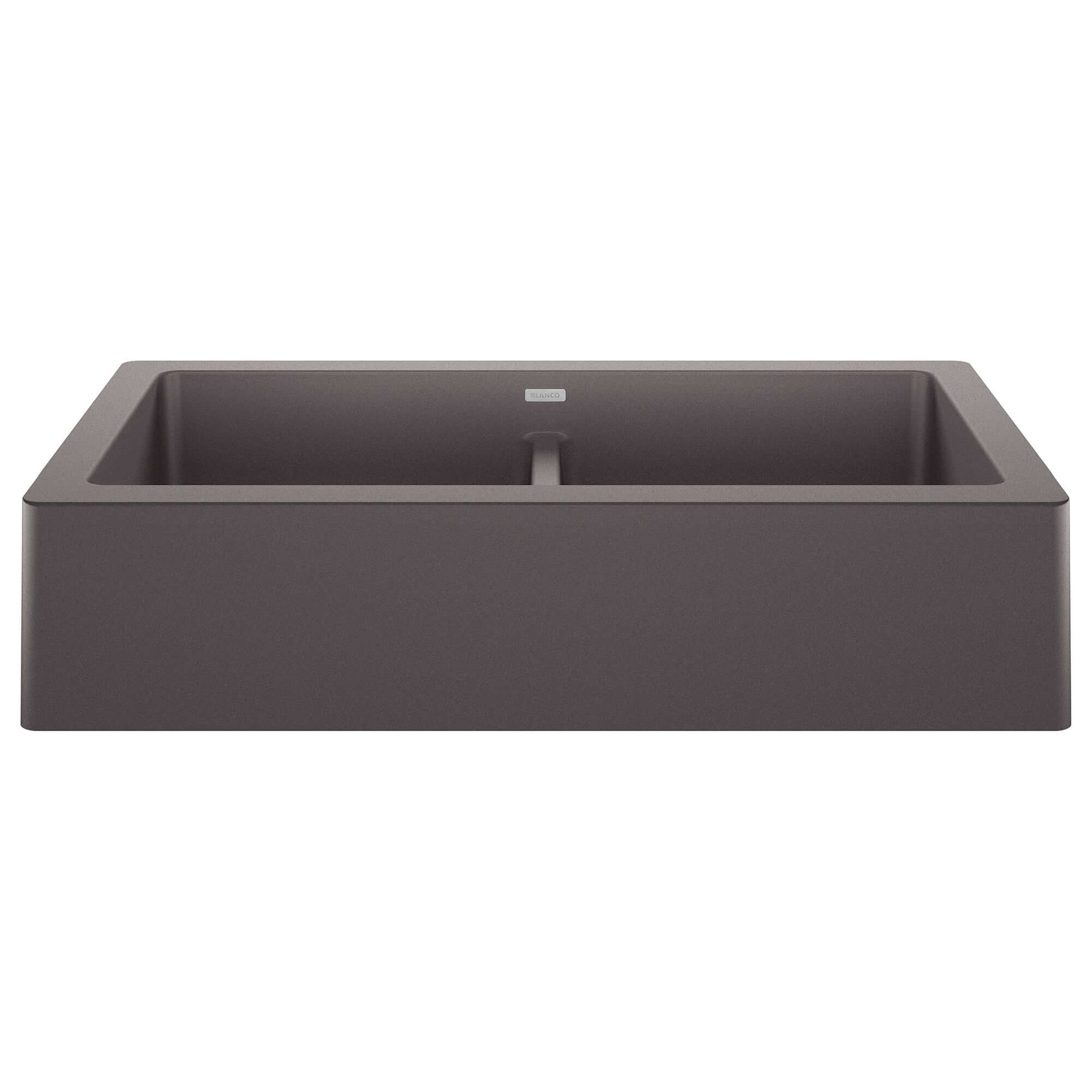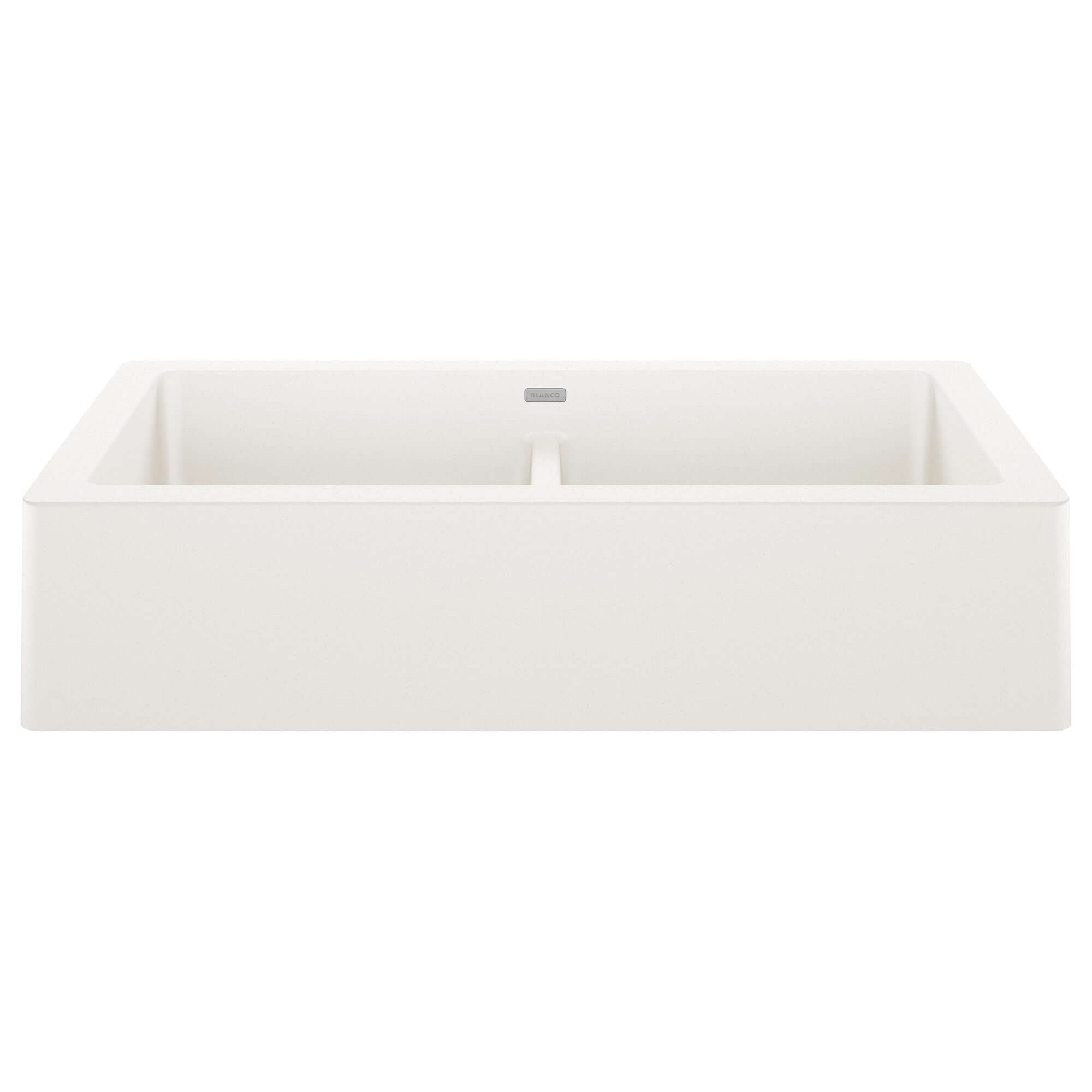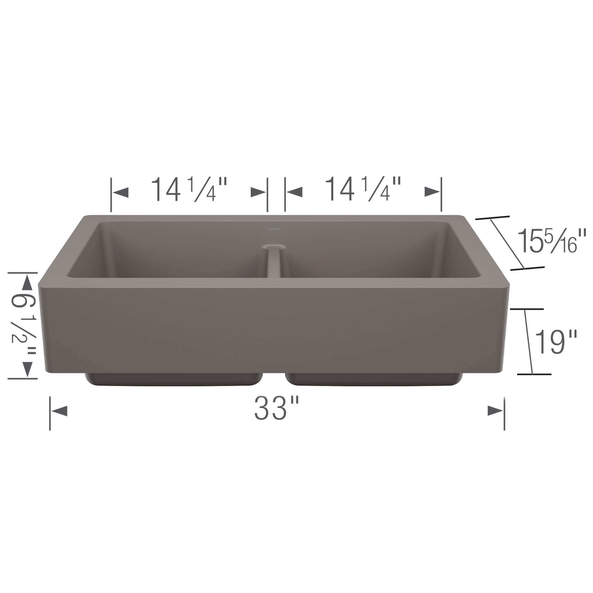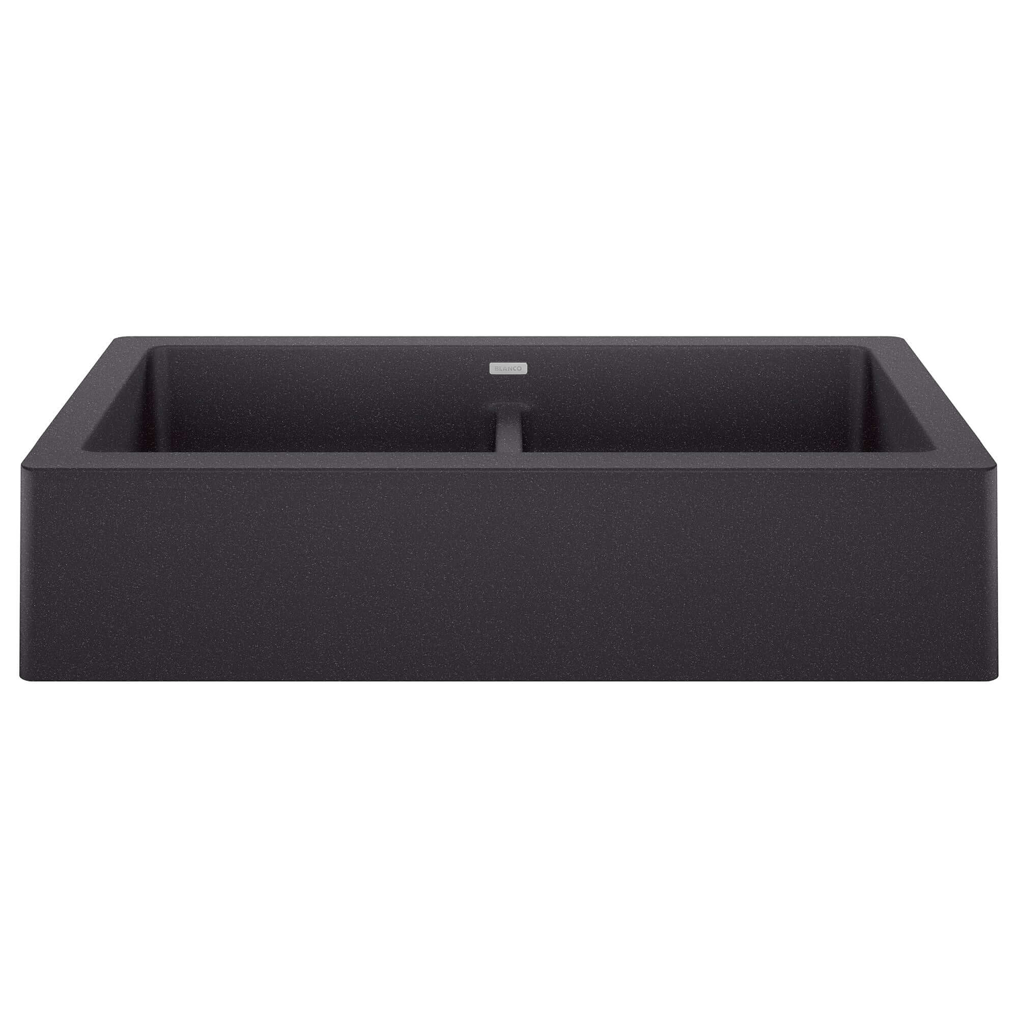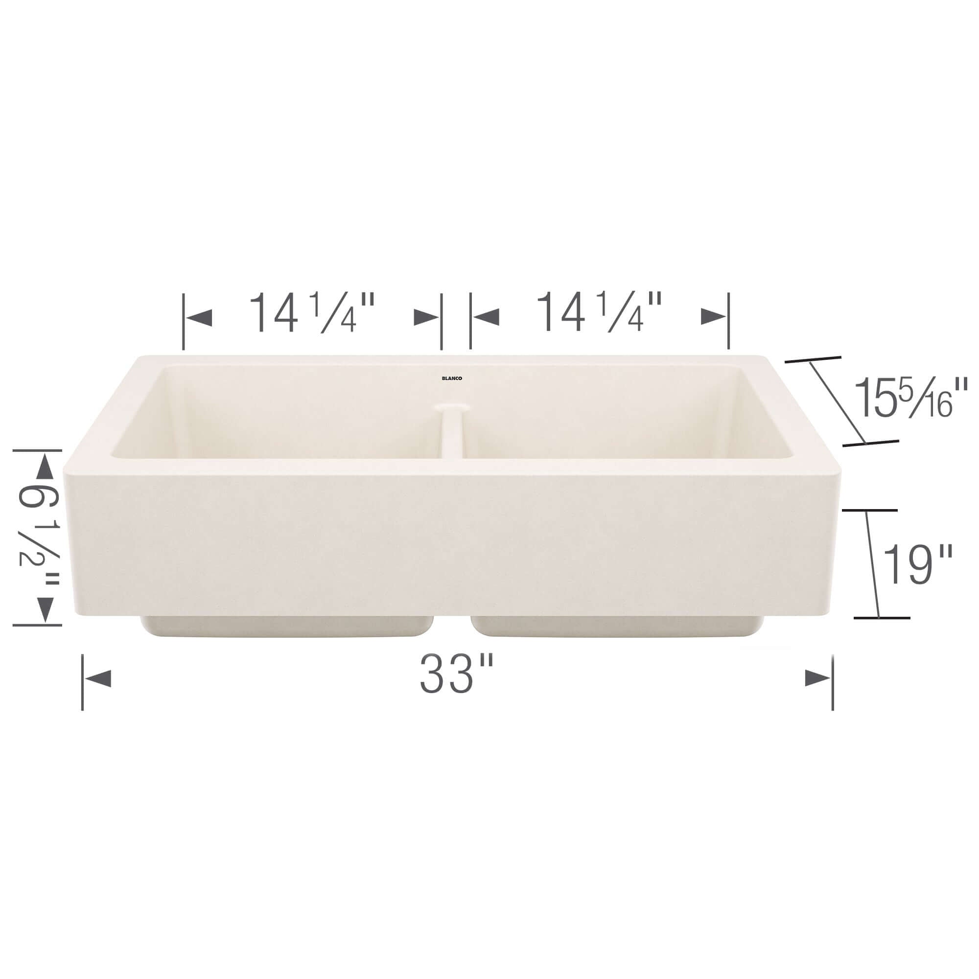 Transform your kitchen with the VINTERA 33" equal double bowl apron-front sink that reimagines the classic farmhouse style for modern kitchens. The slim 6.5-inch apron and generous 9-inch bowl depth deliver the aesthetic appeal of traditional farmhouse sinks while fitting into standard 33-inch width base cabinets—matching the sink width to the cabinet width without requiring oversized custom cabinetry. Made from BLANCO's patented SILGRANIT composite material, this sink combines the hardness of quartz sand with advanced engineering to withstand heavy cookware and hot bakeware. The versatile installation capabilities allow for unique flushmount placement, creating a seamless integration with your countertop that enhances both functionality and visual appeal. Note that farmhouse installation requires modification of the cabinet front to expose the apron.