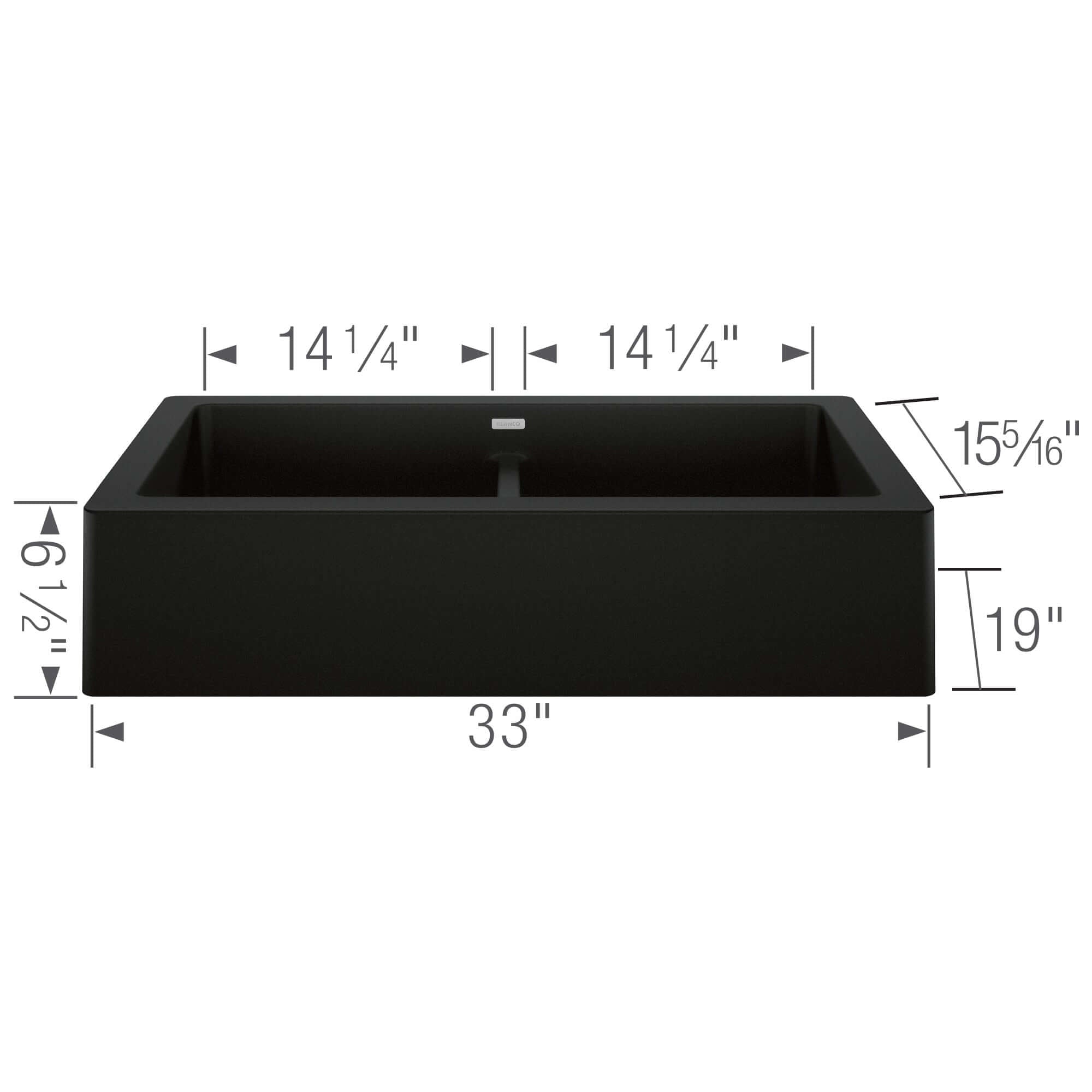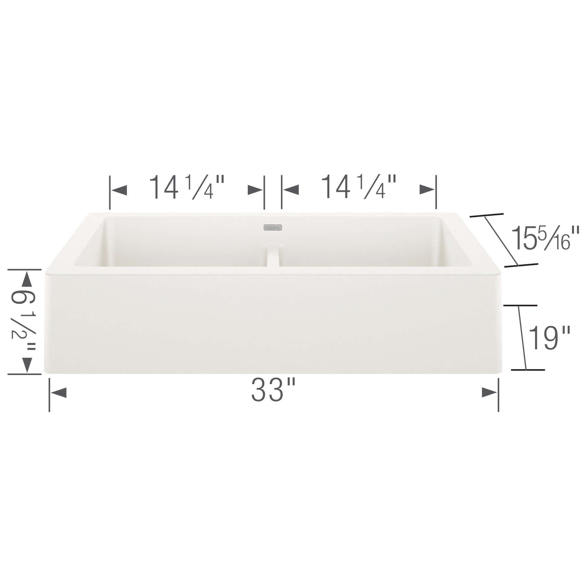 Note: Requires 33" minimum cabinet width. Cabinet front modification required for apron exposure. Cutout dimensions: 29.79" x 15.56". Basket strainers sold separately. Professional installation recommended.